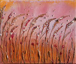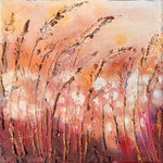 Ten obraz to ciepły, lekko jesienny pejzaż traw poruszanych wiatrem. Malując go, chciałam uchwycić moment ulotny - ciszę i ruch jednocześnie. Tło w odcieniach różu, pomarańczu i złota daje poczucie miękkiego światła. Użyłam faktury, by trawy były niemal namacalne - pełne życia ale też spokoju. Ten obraz przypomina mi, że nawet w delikatności jest siła i że wszsytko, co rośnie, szuka światła.